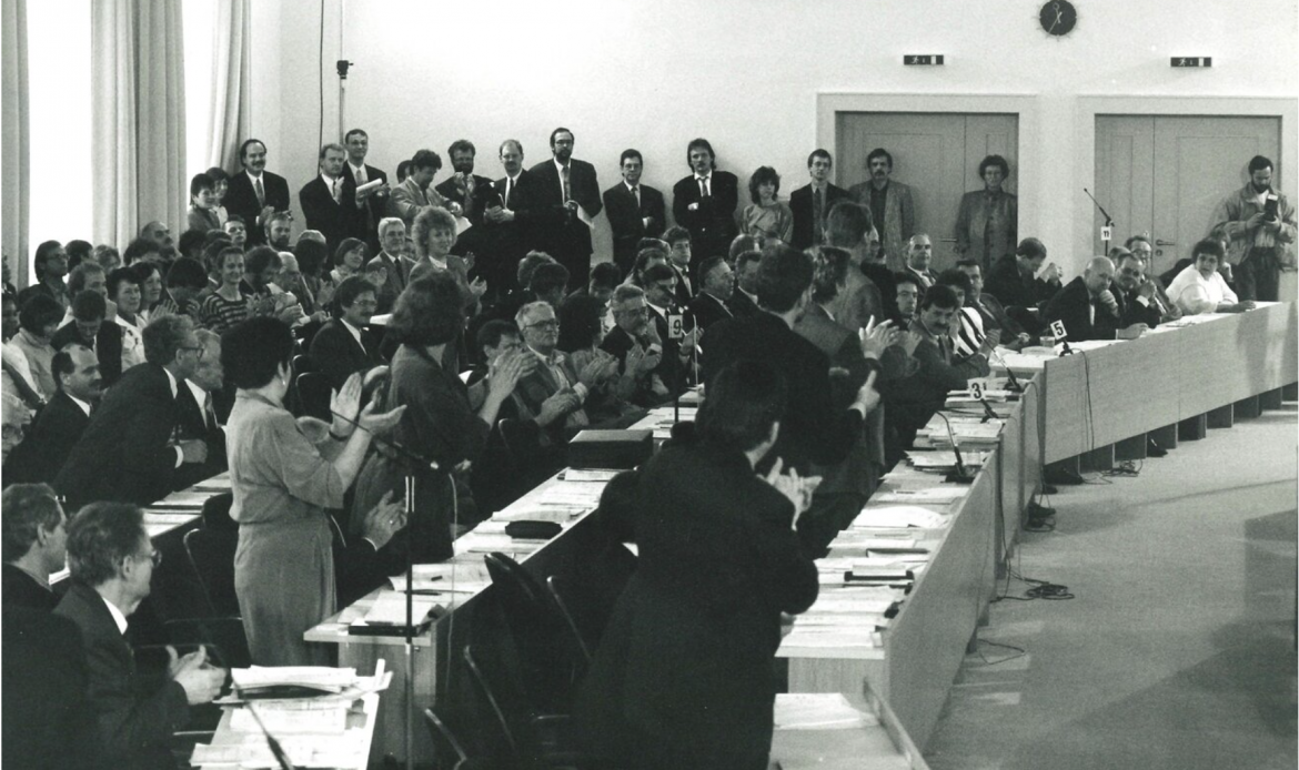 Am 14. Juni 1992 gaben sich die Brandenburger Bürgerinnen und Bürger im letzten Schritt per Volksentscheid ihre eigene Verfassung. Damit hatte Brandenburg das Rennen um die schnellste Ausarbeitung einer Landesverfassung in den fünf neuen Bundesländern für sich entschieden. | Foto Dietmar Horn , Quelle: https://www.politische-bildung-brandenburg.de/themen/verfassung-ja-bitte